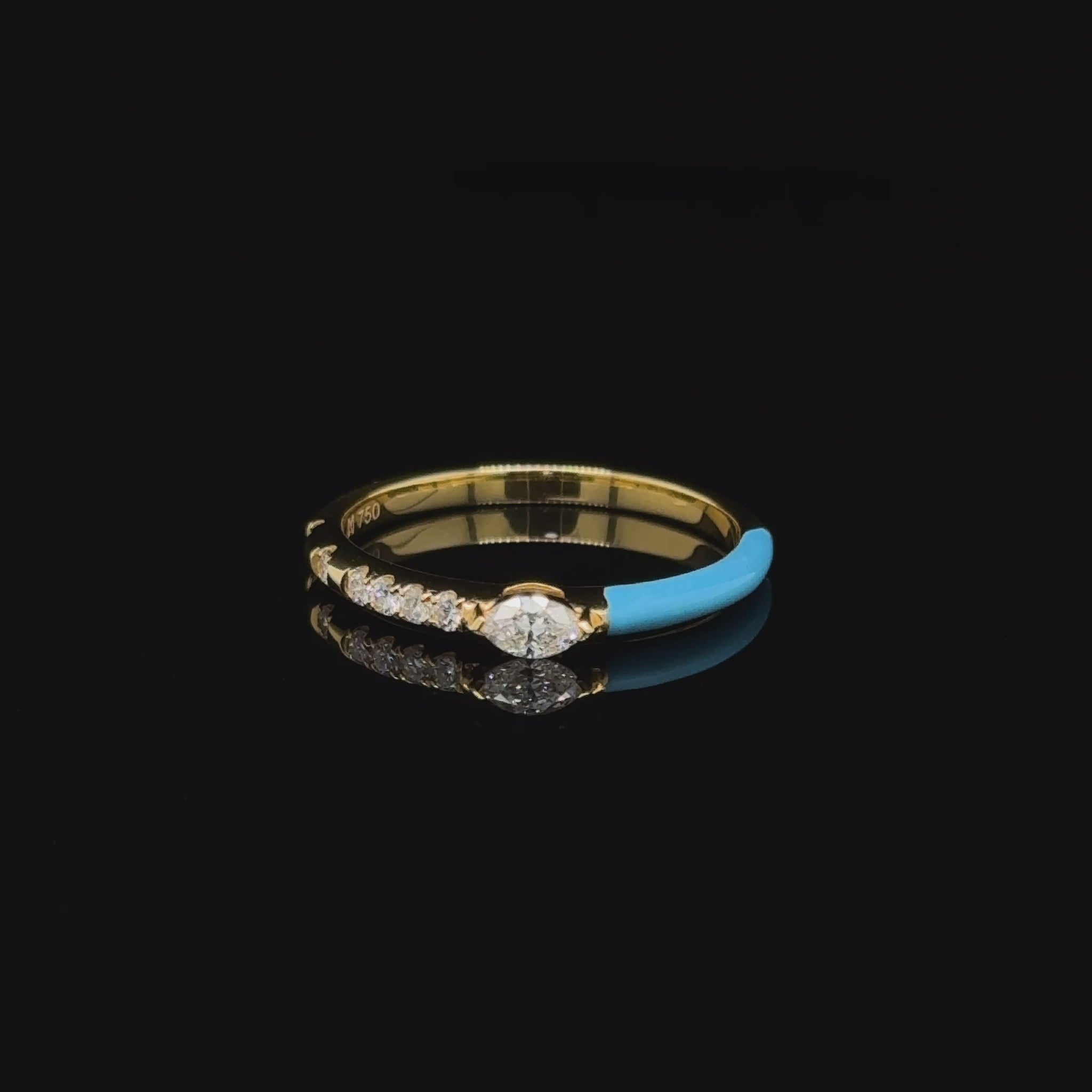 Elegant and contemporary, this 18K yellow gold ring showcases a refined balance of colour and brilliance. At the centre sits a radiant white diamond, offering timeless sparkle. One side of the band features six round-cut diamonds (0.09ct total), enhancing the ring with delicate shimmer, while the opposite arm is adorned with blue enamel—applied to half of the band for a modern, artistic touch. Designed for stacking or wearing solo, this ring adds a vibrant yet sophisticated accent to any jewellery collection. Additional colour combinations are available for personalised styling.