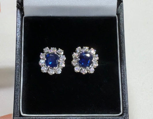Royal Blue Unheated Sapphire & Diamond Cushion Cut Earrings 18K White Gold